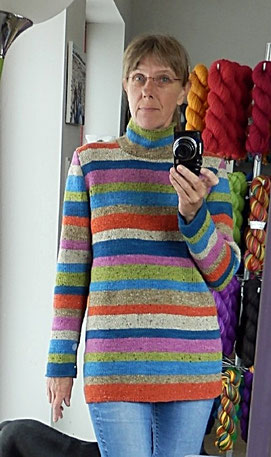 Ringelding aus Soft Donegal ist ein extralanger klassicher Pullover und wird in Einzelteilen von unten nach oben gestrickt. Vorder- und Rückenteil sind leicht A-linienförmig geschnitten. Die Schultern werden mit verkürzten Reihen gearbeitet. Die Schulternähte werden mit der 3-Nadel-Abbindetechnik zusammengestrickt. Die Ärmel erhalten eine Armkugel und müssen eingenäht werden. Die Saumblenden sowie die Kragenabschlusskante werden nach dem Zusammennähen in Runden angehäkelt. Der Kragen wird in Runden gestrickt.